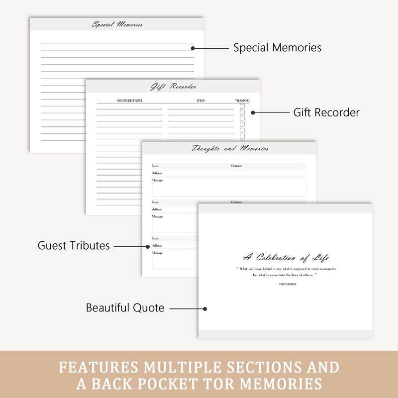- Premium Quality Pages: Thick, archival-quality paper prevents ink bleeding, ensuring every signature and heartfelt message in this funeral registry book remains crisp and legible for years to come. Includes a convenient back pocket for storing photos and sympathy cards