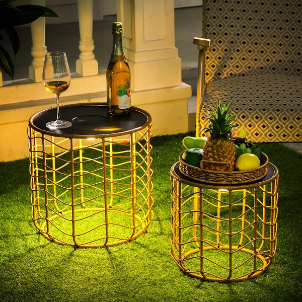 - Bohemian Style Outdoor Table: you will receive 2 sets of outdoor side tables; Transform your outdoor space with solar outdoor tables; Handcrafted from durable, weatherproof plastic rattan, these boho end tables effortlessly enhance your patio, balcony, or garden with their minimalist charm and natural tones