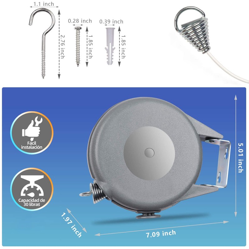 - 【FÁCIL INSTALACIÓN】: Este tendedero fácil de colgar incluye todo el hardware necesario para una instalación rápida de bricolaje. Con una longitud total de 15 metros, un diseño retráctil inteligente con botón de parada que le permite ajustar la longitud según sus necesidades, además de una capacidad de peso de 30 libras.