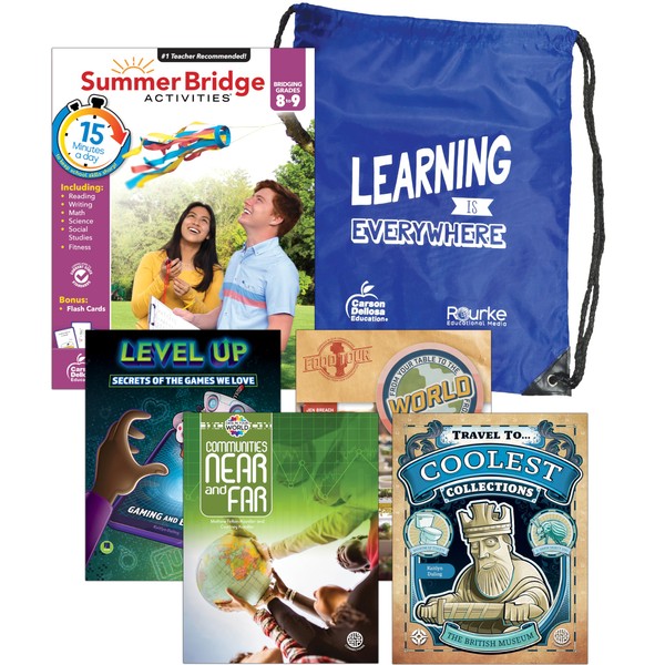 Summer Bridge Activities 8-9 Bundle, Ages 13-14, Math, Reading Comprehension, Writing, Science Summer Learning 9th Grade Workbooks All Subjects With Flash Cards, Children's Books, Drawstring Bag