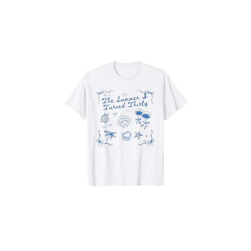 - Summer I turned thirty 30th birthday seashell coastal beach design for womens 30th birthday party, featuring seashell, coastal beach, 30th birthday party decorations, this outfit is great for girls trip, summer vacation, bachelorette party, 30th bday gift.