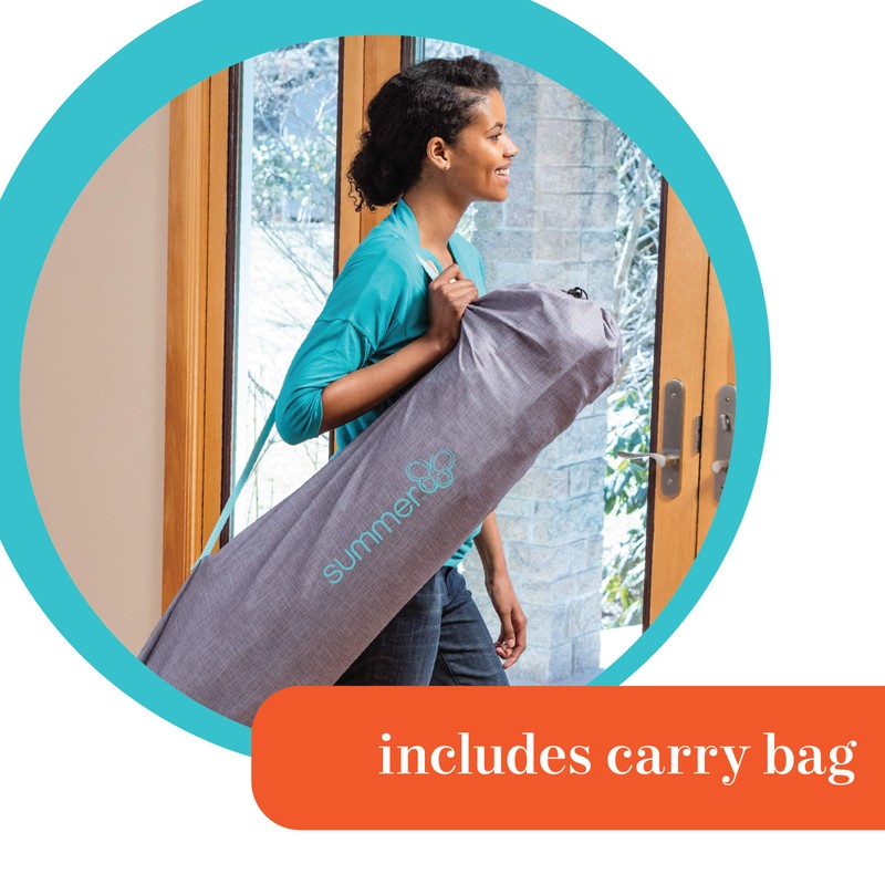 The Summer Pop 'N Play Deluxe Ultimate Playard allows you to easily create a safe, portable play area for your little one. This ultra-lightweight and compact playpen can be set up and taken down in seconds, making it perfect for use at home or on the go, inside or out. Features include a clip on full coverage canopy, padded floor, and touchscreen enabled entrainment pouch. A travel bag with shoulder strap is included for added convenience on-the-go.