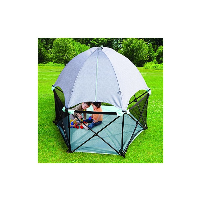 - FULL COVERAGE - Enjoy the outdoors even on sunny days, thanks to the full coverage canopy with two zip-open panels and mesh sides. The play yard for baby and toddler blocks 98% of harmful UVA/UVB rays.