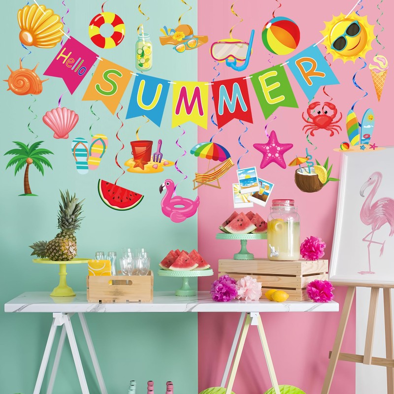 - What you will get: the summer party decorations set includes 1pcs hello summer banner and 19pcs summer theme hanging swirls decorations, total 28pcs beach hanging cards. This summer party decoration will bring you a relaxing and comfortable summer atmosphere.