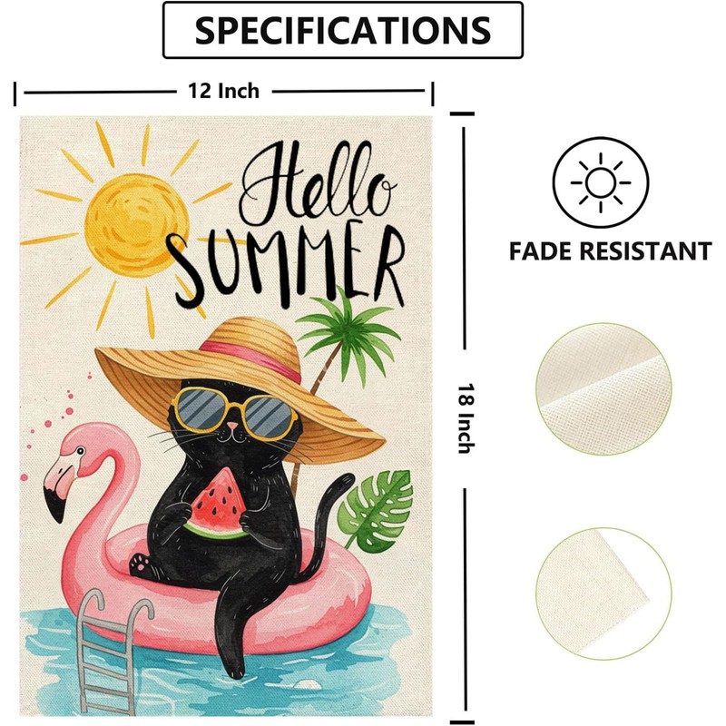 Summer Pool Garden Flag 12x18 Inch Double Sided for Outside Cat with Sunglass Flamingo Sun Hat Watermelon Small Outdoor Beach Holiday Decor
