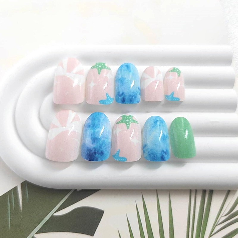 Summer Press on Nails Short Oval False Nails with Bow Star Irregular Gradient...