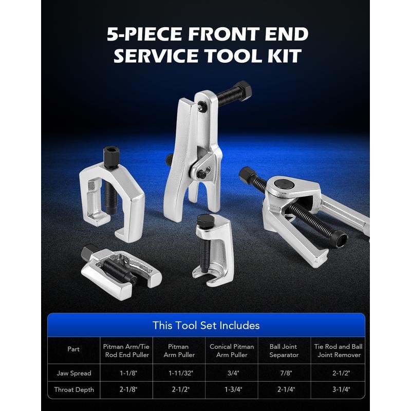 ALL IN ONE FRONT END SERVICE KIT: Containing 5 adjustable tools for a wide range of domestic and import vehicles. Comes with 1x Ball Joint Separator, 1x Tie Rod and Ball Joint Remover, 1x Conical Pitman Arm Puller, 1x Pitman Arm and Tie Rod End Puller, 1x Pitman Arm Puller, 1x well-organized ABS case
