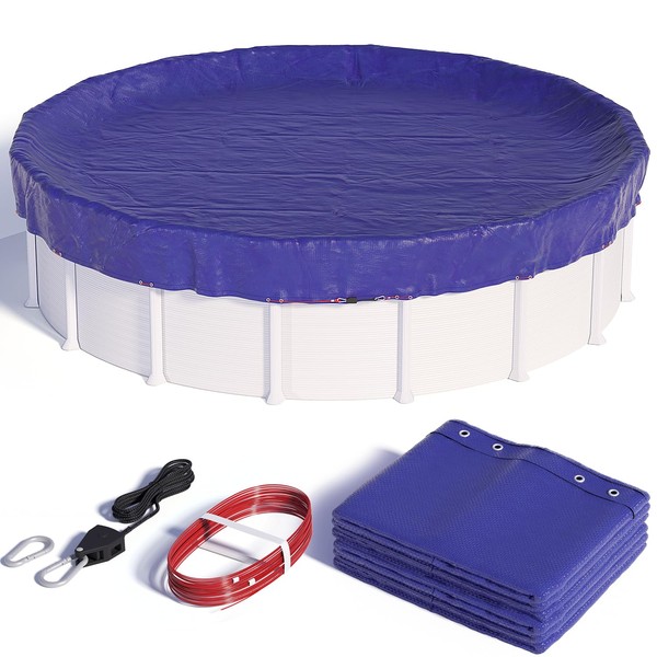 SUMMERBUDDY Winter Pool Cover 24 FT Round Above Ground, [ 2025 Upgraded ] Above Ground Pool Cover with Accessories, 24 FT Round Pool Cover, Cable & Pulley System (Blue)