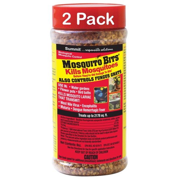 Summit Mosquito Bits is a highly selective microbial insecticide (BTI) effective against mosquitoes in a variety of habitats. Kills Mosquito larvae that transmit West Nile Virus, Encephalitis, Malaria, Dengue Hemorrhagic Fever. When spread uniformly over the surface of containerized water the BITS release a biological mosquito larvicide at the water's surface. This larvicide gradually settles in the water where it is eaten by mosquito larvae growing there. Summit Mosquito Bits may be used in all types of containerized standing water sites where mosquito larvae grow. The Bits will give a quick kill within 24 hours. For more residual long-term control please consider the use of Summit Mosquito Dunks after applying Summit Mosquito Bits. Summit Mosquito Bits can be applied to areas that contain aquatic life, fish and plants. Can be applied to areas used by or in contact with humans, animals, horses, livestock, pets, birds or wildlife. Apply to standing water found near the house such as water gardens, tree holes, stock tanks, animal watering troughs, rain barrels, bird baths, roof gutters, etc. May also be used to control Fungus Gnats. Sprinkle or spread the granules over the soil until the area is covered. Water will release the BTI into the soil where the larvae of the Fungus Gnats will feed on it and die. Repeat this process for a three week period for control. If Fungus Gnats reappear, repeat process for another three week period.