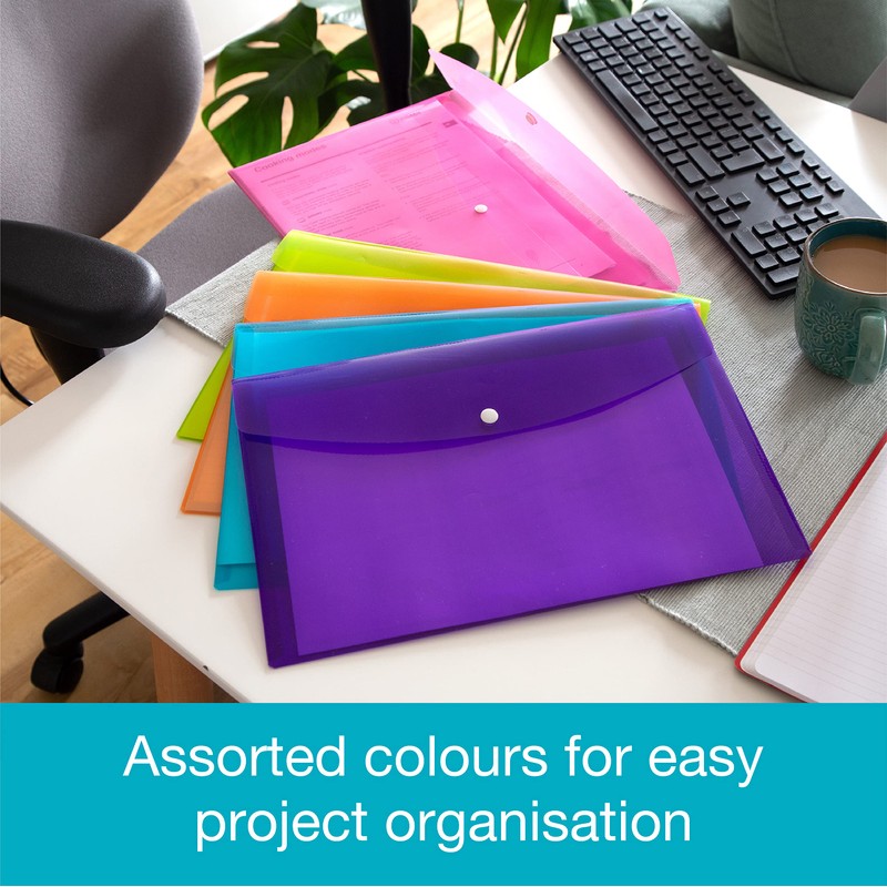 SUMMIT A4+ Plastic Popper Wallets, Assorted Colours, Document Folders, Pack of 5