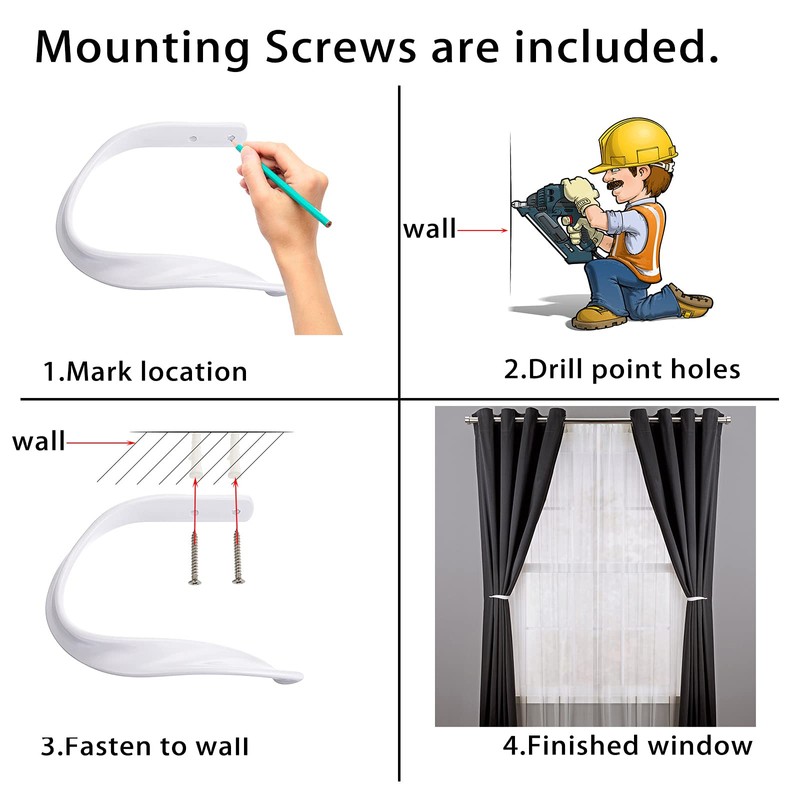 - ✿Quick & Easy installation: The window treatment holdbacks are very easy to install, and come with screws, you can choose to install them on the two side of your window to hook your curtain in, or you can also use them as curtain rod brackets for heavy duty rod.