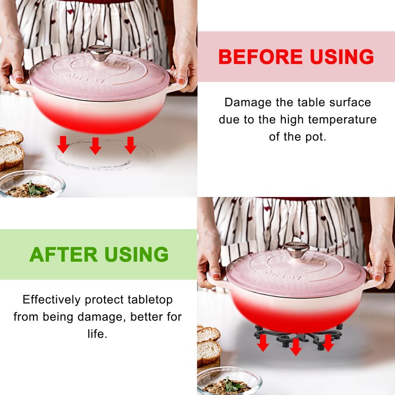- High Quality - Functional trivet is made of high quality cast iron material, it's sturdy and solid for long-lasting use, and no worry about that it will break or rust easily; The rubber feets of the trivet are cushioned, so it won't slide and scratch your countertop.