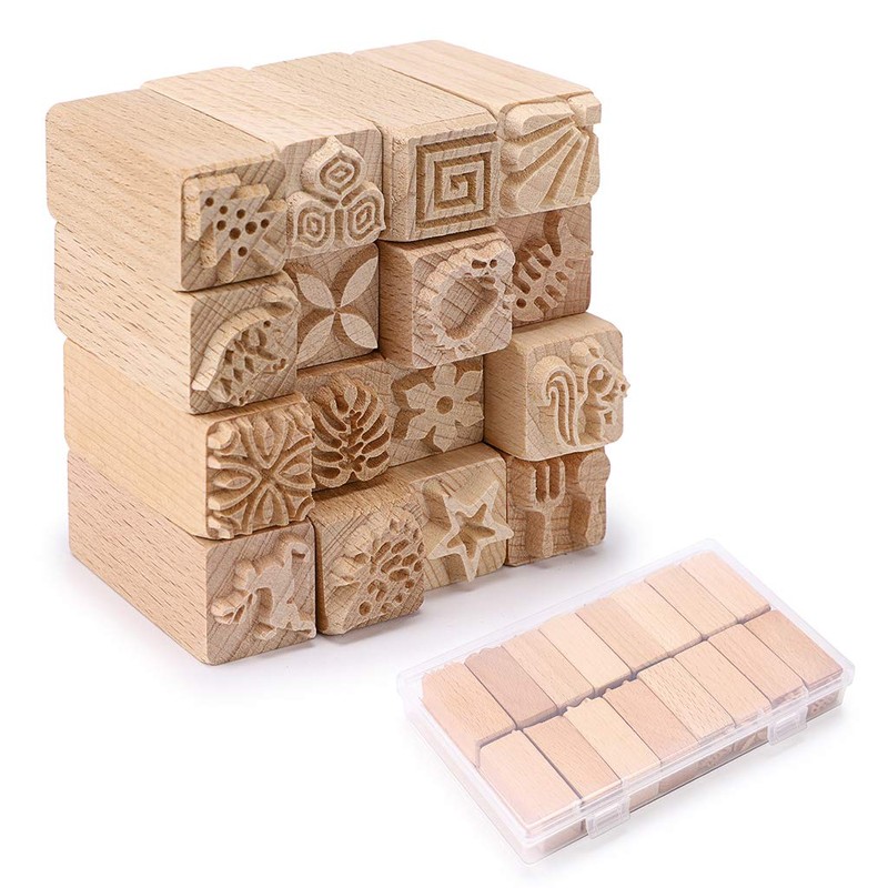 Sumnacon Pottery Clay Tools Stamp Mold, Wooden Pottery Supplies, Clay Stamp Tool, Hand Roller, Different Patterns (Set of 16)