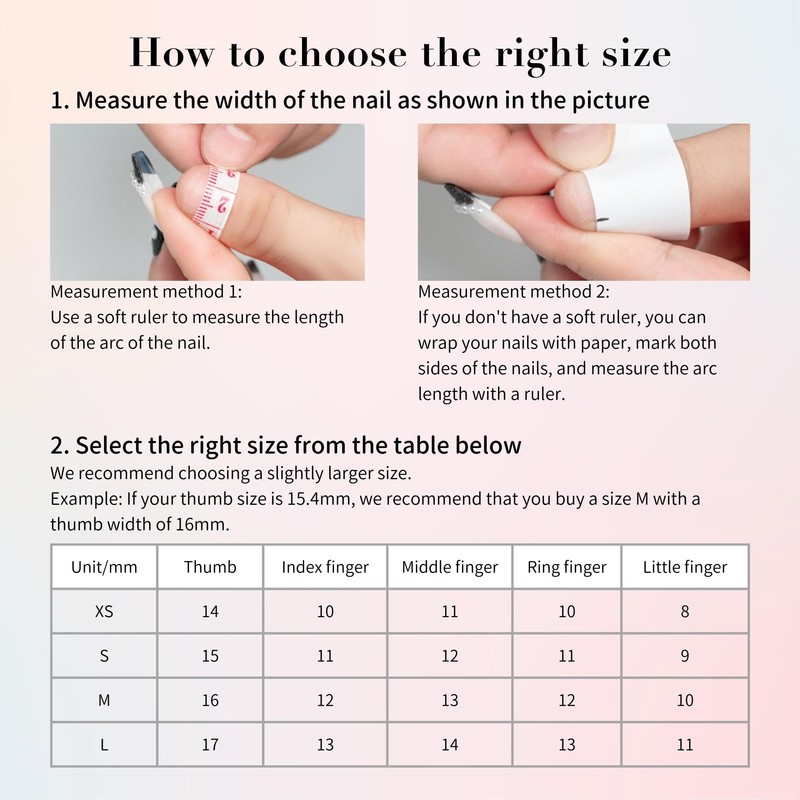 - 🎁【Package Contents】Press-on nails (10 pcs), nail tabs (24 pcs), a nail remover stick, a nail file, and a storage box. ※Please refer to the product picture for how to measure and choose the size. ※It is recommended to use the jelly glue recommended below for the best results and reusability.