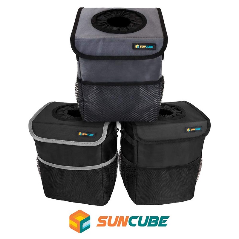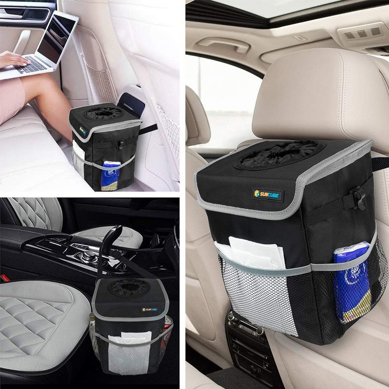 SUN CUBE cubeta de basura para automóvil con tapa, bolsillos de malla, resistente al agua, para colgar el basurero del automóvil, a prueba de fugas, organizador de bolsas de basura para reposacabezas, consola, camión (negro/gris)