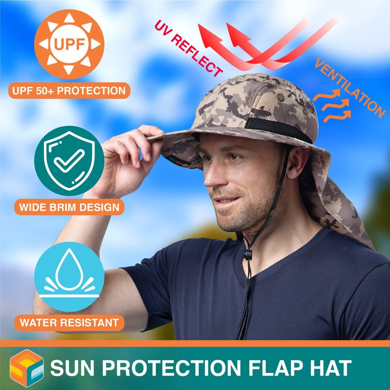 SUN CUBE Sombrero de pesca para hombre con solapa para el cuello para hombre | Sombrero de sol con ala ancha para senderismo, safari con cubierta para el cuello para protección solar al aire última intervensión UPF50+ | Gris camuflaje