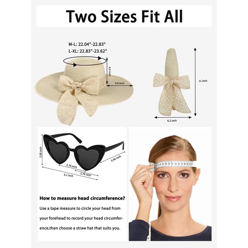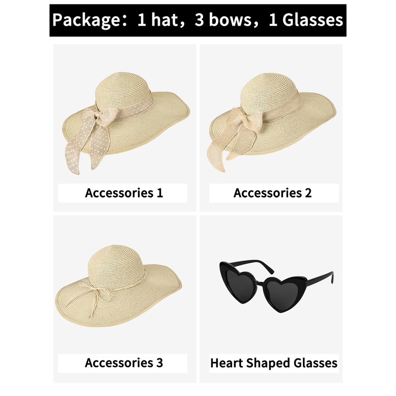 - Material and Package: Sun hat set is made of lightweight and breathable paper straw, polyester; includes 1 X sun hats for women, 1 X black heart shaped sunglasses, 1 X polka dot bow, 1 X solid bow, 1 X thin black bow