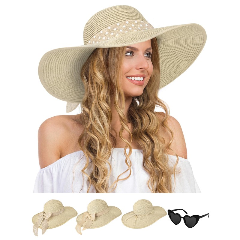 Sun Hats for Women, Wide Brim Floppy Beach Straw Hat for Summer Travel Vacation Foldable with Heart Shaped Sunglasses UPF 50+ Beige