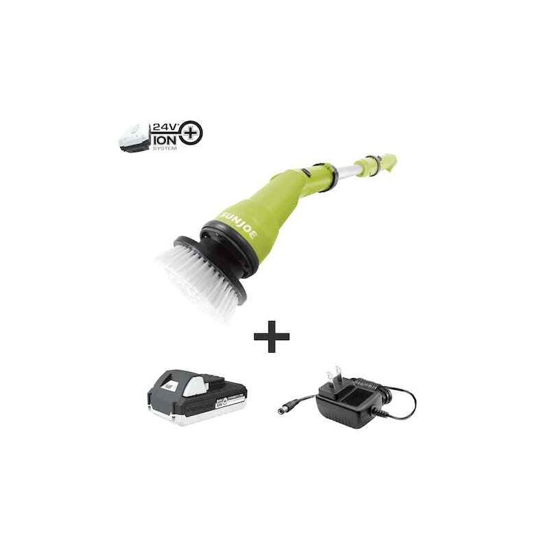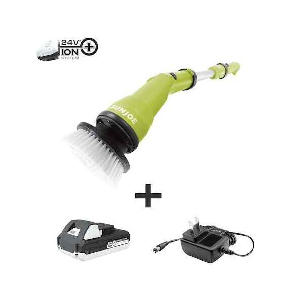 CLEAN HIGH SCRUB LOW WITH JOE! Take the tiring, tedious, repetitive work out of your cleaning to-do list with the 24V-PWSCRB-LTW 24-Volt* Cordless Power Scrubber from SUN JOE! No more endless scrubbing by hand – tackle the toughest messes, mold and mildew, stains and more at home or on-the-go with cordless convenience. Perfect anywhere power is at a premium, like the laundromat, garage, pool or patio, SUN JOE’s power scrubbing dynamo also makes light work of household grime in the kitchen, laundry room or bathroom. Simply select from the four included, easy to clean, scrubbing brush heads to suit the task. The rotating head spins at two variable speeds — LOW (600 rpm) and HIGH (1000 rpm) — for light- to heavy-duty cleaning tasks. Effortlessly clean large surfaces in less time with the round brush or large flat brush head; Or, get in grout lines and corners with the cone brush and small flat brush. And SUN JOE doesn’t stop there! Go beyond the kitchen and bathroom with IONMAX power — the rechargeable lithium-ion battery system with a world of possibilities. Clean the car, tires hub caps, scrub gunk off of the grill, wash the windows, get grime off of grout and granite, and so much more! Reach high or low without bending! SUN JOE extends from 27 in. to 50 in. with the included pole attachment to get to from those hard-to-reach corners of your shower and tub without the pain and strain on your back and knees. And when the job is done, simply remove the extension pole for compact, convenient storage in the closet or cabinet. Clean the whole house — from top to bottom and corner to corner — with SUN JOE! GET EQUIPPED.