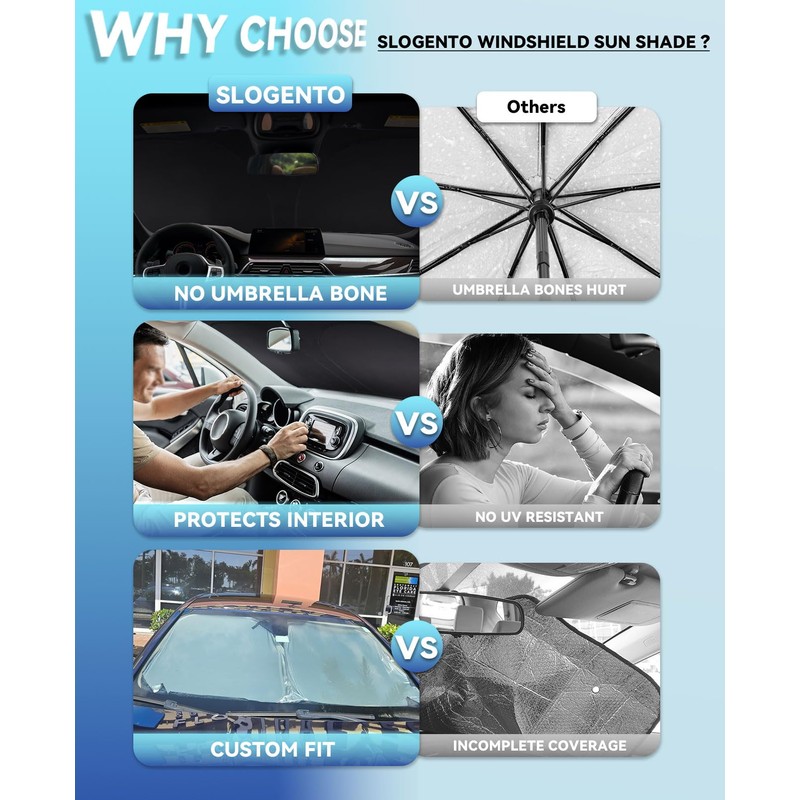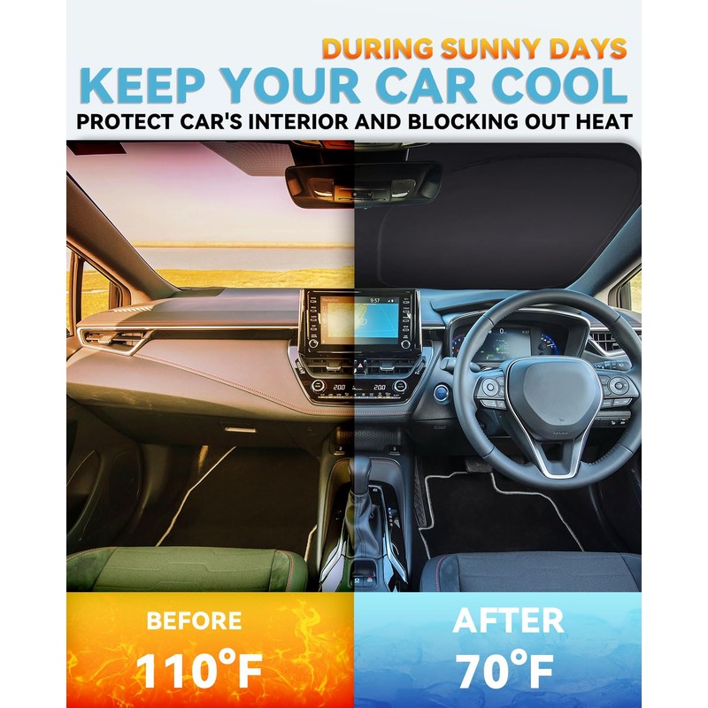 • 【Blocks excessive hot sun & heat】: Made of 240T polyester fabric with a black insulation layer and a silver reflective layer, this sunshade is lightweight and wear-resistant, providing superior insulation and sun protection. Save energy and gasoline by eliminating the need to wait 15 minutes for your car to cool down on hot days.
