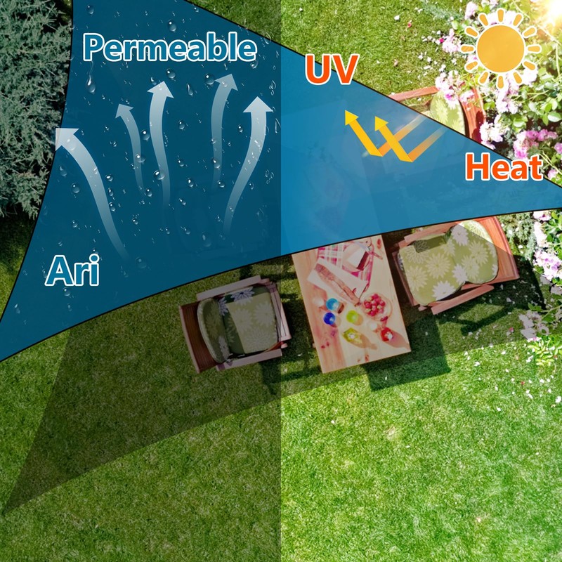- 【Sun Protection & Waterproof】: The outdoor sun shade sail, made of Polyester Taffeta, is waterproof and you can use it in a slightly rainy day, but not heavy rain. It can also shade the sun to prevent you from exposing to the blazing sun in summer. You can use it in the patios, backyard, lawn, garden, carport, deck, pool, bbq areas, courtyard,dooryard, pergola, sandbox, coffee bar,or any other outdoor area.