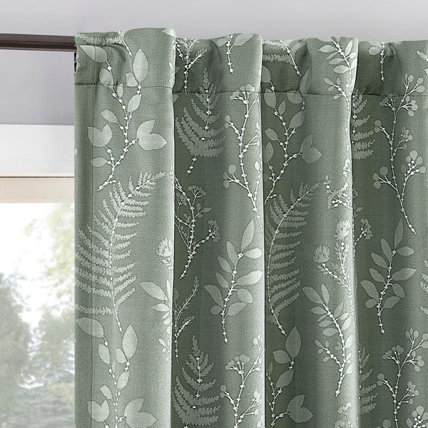 Sun Zero Ambridge 2-Pack Embroidered Botanical Leaf Pleated Look 100% Blackout Back Tab Curtain Panel Pair, 50" x 96", Sage Green