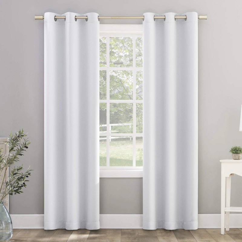 Sun Zero Riley Kids Bedroom Blackout Grommet Curtain Panels add a bright, fun pop of color to a kids bedroom, playroom, or any room of your home. Equipped with built-in metal grommets for easy hanging on standard curtain rods up to 1.5" in diameter. Sun Zero Blackout technology blocks out most outside light, offers outside noise reduction by up to 30%, and decreases energy lost through your windows by up to 40%. Comfort is optimized with thermal properties that help keep summer heat and winter chill out of the room. Sold as individual panels measuring 40" width by 84" length in color white. Measure carefully before selecting your desired size and quantity. Rod not included. Machine wash cold on gentle cycle. Use non-chlorine bleach when needed. Tumble dry on low heat, using a cool iron as needed.