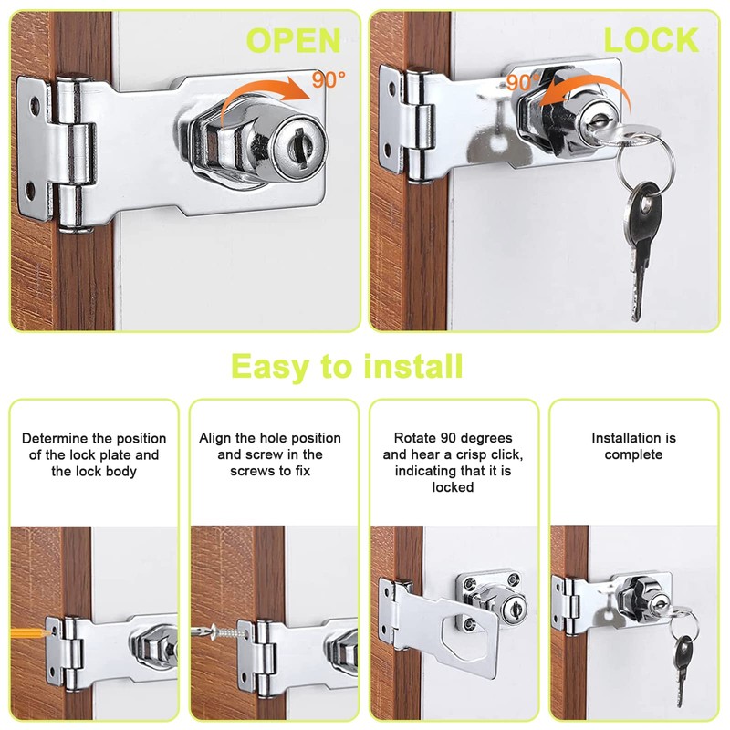 - [Easy to Use And Install]: Keyed locking hasps are simple to use and operate, no drilling required, just screw the lock into the position you wish to install it. The automatic knob hide lock can be locked by turning it 90 degrees and you will need a key to unlock it for added security.