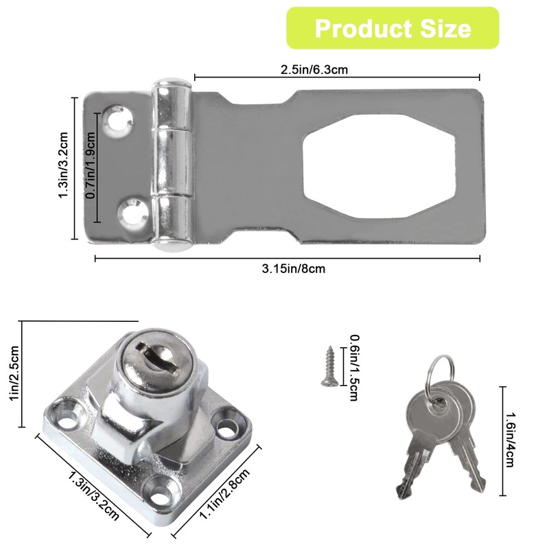 - [Package Include]: You will receive 2pcs 2.5 inches door lock hasp, each lock has 2 keys and 6pcs screws(total 12pcs screws). Size: 63*32mm, total length: 80mm.2 packs door lock hasp with keys are sufficient for your daily use, which can well meet your needs.