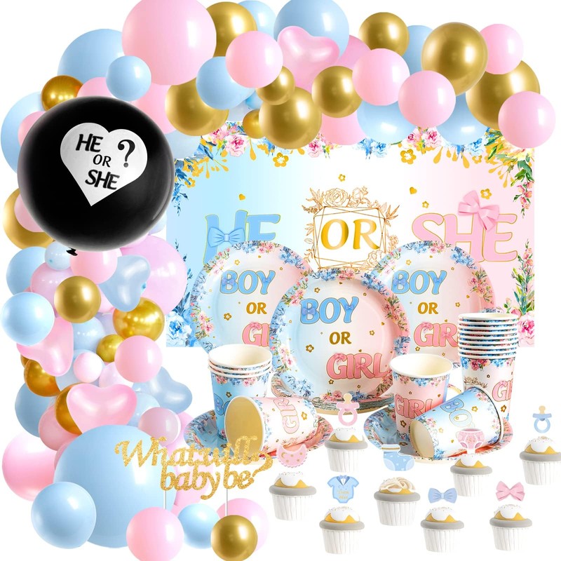 - 🌠Gender Reveal Partydekoration Set: schwarzer 36" Gender Reveal Ballon x 1, 54x Latexballons (gold, rosa, blau), 20g goldenes und rosa Konfetti, 20g goldenes und blaues Konfetti, Folienballon für Junge oder Mädchen, 12x 18cm Pappteller, 12x Folienbecher, 13x Torteneinsatz, 1x Gender Reveal Kulissenstoff, Ballonstreifen, Klebepunkte.