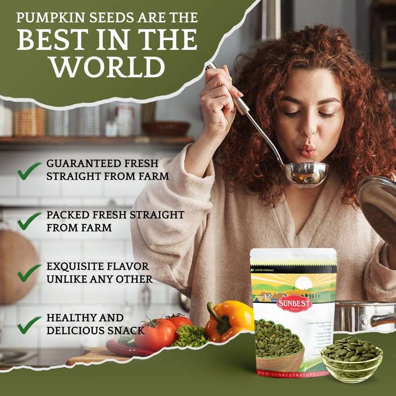 Enjoy guilt-free meals anytime, anywhere. Get your Sunbest Natural Salted, Roasted, & Shelled Pumpkin Seeds today!