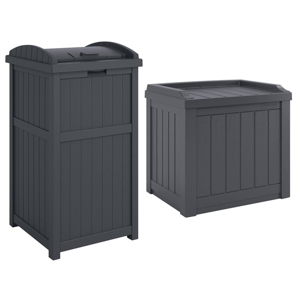 Suncast 22-Gallon Outdoor Patio Backyard Deck Box Storage Bench and 30-Gallon Hideaway Trash Waste Bin with Latching Lid, Cyberspace