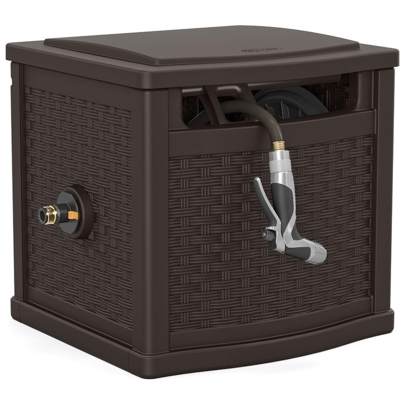 Suncast 150 Foot Slide Trak Outdoor Garden Wicker Resin Water Hose and Reel Hideaway with Brass Connections for Patio or Backyard, Java