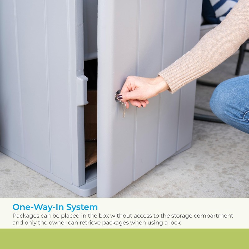 - SECURE ACCESS: One-way in-system ensures packages can be placed in the front porch drop box without access to the storage compartment; only the owner can retrieve packages when using the lock and key