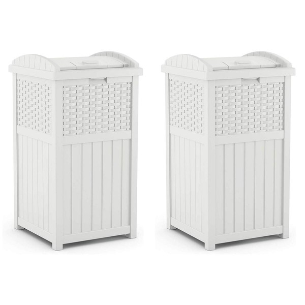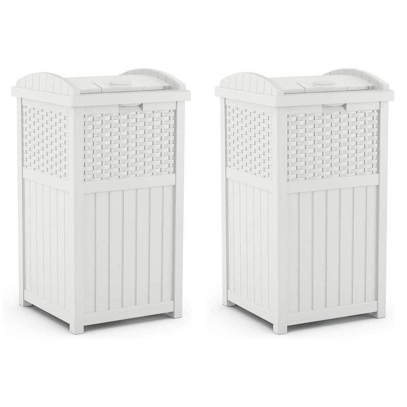 Suncast Wicker Plastic Outdoor Hideaway 33 Gallon Trash Can Bin with Latching Lid for Backyard, Deck, or Patio Use, White (2 Pack)