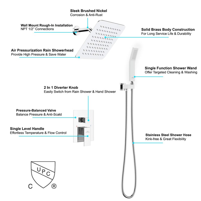 • AIR PRESSURIZATION: With adoption of innovative air injection technology, even in low water pressure installations, the 8 inches raining showerhead mixes water with air to increase the water pressure, and simulates the natural raining to provide you with natural contact of water experience.