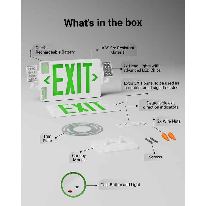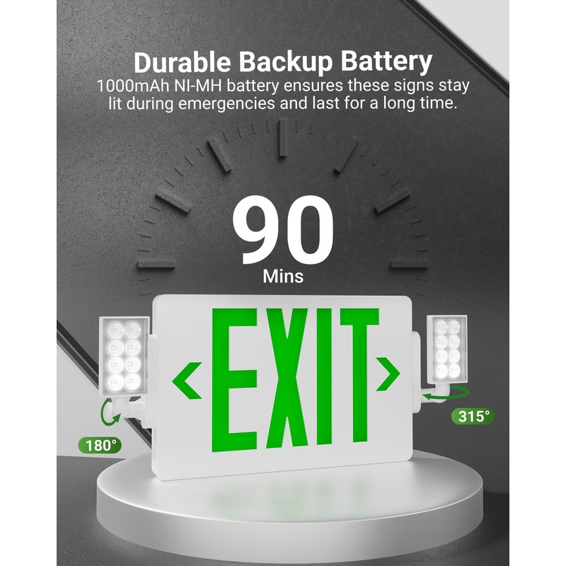 - ✅ SAFETY FIRST - The exit sign has bright adjustable lights on each side of the sign for maximum visibility. US standard green 6" high letters with 3/4" stroke are visible from up to 100 feet away. In case of a power outage, the backup battery automatically illuminates (90 minutes) the fixture and light the way to safety.