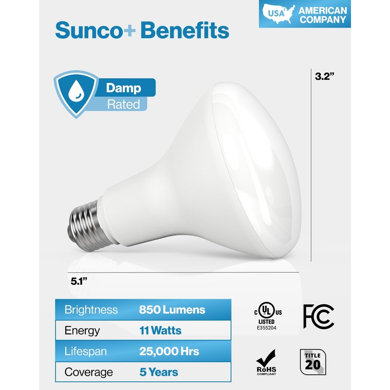 Sunco 8 Pack BR30 LED Bulbs Indoor Flood Lights 11W Equivalent 90W, 5000K Daylight, 850 LM, E26 Base, 25,000 Lifetime Hours, Interior Dimmable Recessed Can Light Bulbs - UL & Energy Star