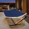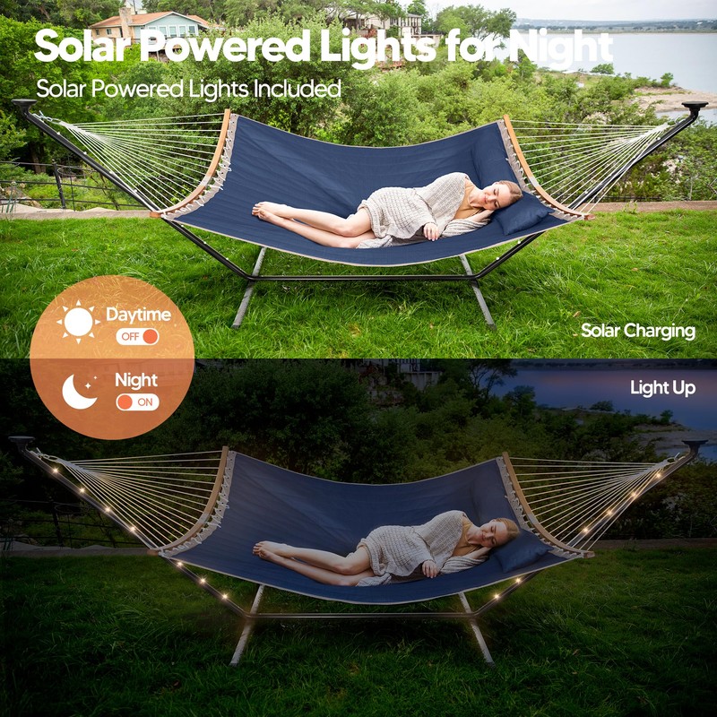SUNCREAT Double Outdoor Hammock with 12 ft Stand, Solar Powered Lights, Portable 2 Person Hammock with Stand, Dark Blue