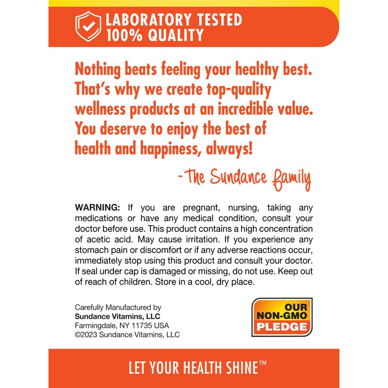 Sundance Vitamins Apple Cider Vinegar quick release capsules are easy to take and free from any harsh aftertaste. Created by fermenting the sugar from apples, Sundance Vitamins Apple Cider Vinegar is sourced with the utmost care and expertly crafted to preserve its superior quality. These quick release capsules deliver 450 mg of Apple Cider Vinegar Powder per serving.