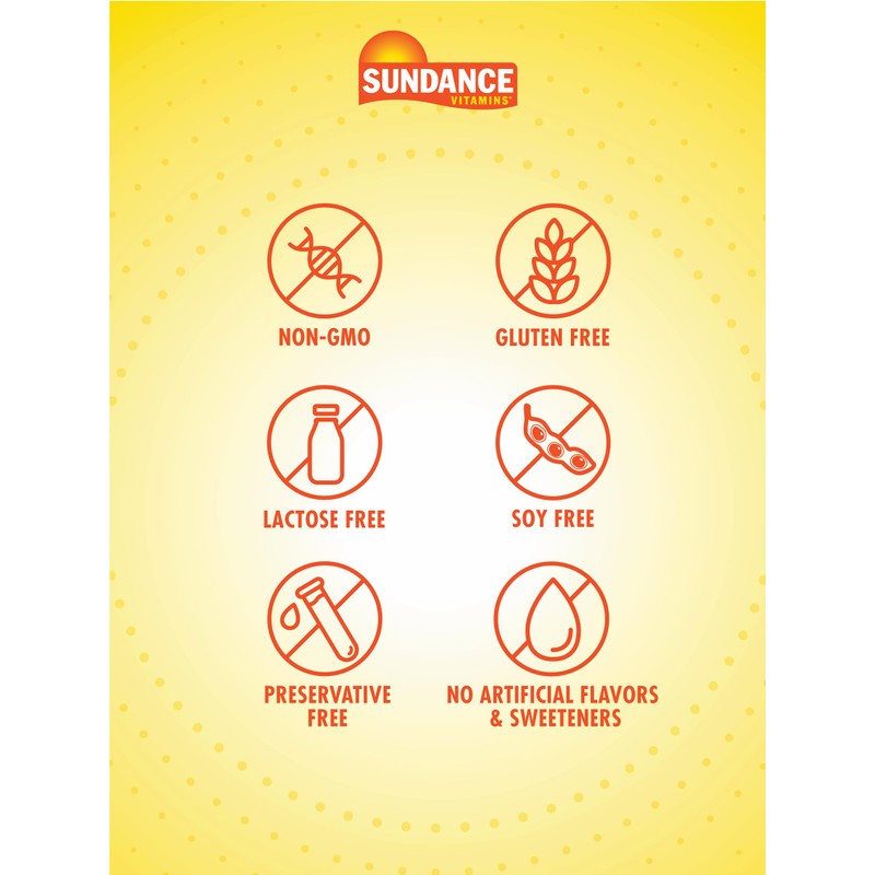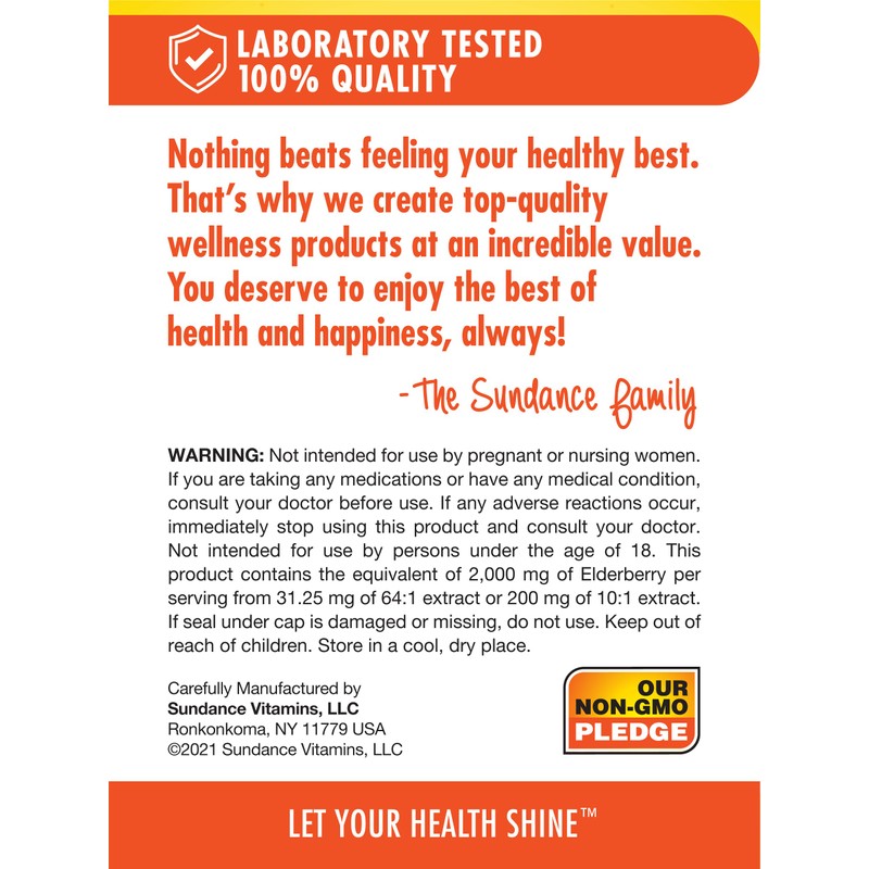 Enjoy an ancient botanical with Sundance Vitamins Sambucus Black Elderberry! Each serving delivers the equivalent of 2,000 mg of Elderberry, from 31.25 mg of 64:1 extract or 200 mg of 10:1 extract per serving.Derived from the fruit of the Sambucus nigra tree, also known as the European Elder tree, elderberry has been used for centuries. This dark purple berry is native to Europe, Asia, and North America and is enjoyed today for its versatility in herbal supplements.These quick release capsules are non-GMO, free of gluten, wheat, yeast, milk, lactose, soy, artificial flavor, sweetener, and preservatives.The vitamins and supplements from Sundance are backed by three generations' worth of industry knowledge. All products undergo rigorous processes and procedures to prioritize quality and safety. With the belief that health and happiness go hand-in-hand, Sundance Vitamins invites you to bask in the sunshine that comes from introducing these high-quality vitamins and supplements into your life.**Equivalent from 31.25 mg of 64:1 extract or 200 mg of 10:1 extract per serving.