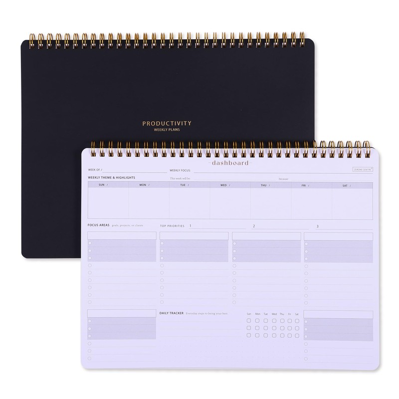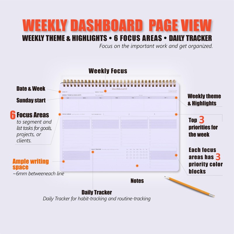 - Weekly Dashboard Features - Productivity desk pad offers 6 Focus Areas to outline your key objectives, projects, clients, budgets, meals, or shopping list for the week. The integrated action plan, presented as a to-do list, ensures your organization and efficiency. Additionally, the large spiral calendar features a daily tracker, weekly theme, and highlights section, simplifying at-a-glance planning.
