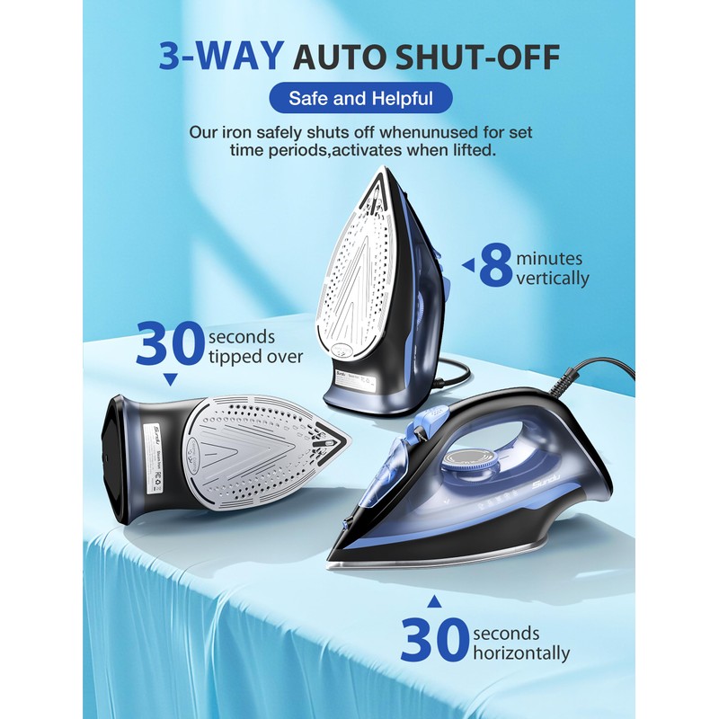 - Safety Feature: Safety comes first. This iron comes with a 3-way automatic shut-off system that automatically turns off the iron after 8 minutes if left sitting vertically and after 30 seconds if left horizontally or tipped over. With the Anti-Drip feature, you don't have to worry about water dripping out of the soleplate at low temperatures or when the iron is not in use. Anti-Calc system prevents mineral and scale build-up which increases the lifetime of the iron.