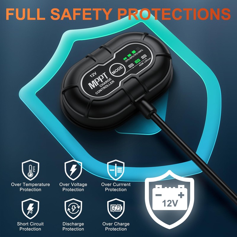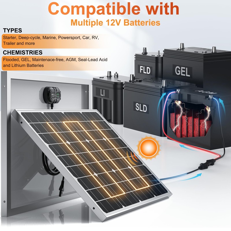 - 【Improved 3-stages Charging】The improved 3-Stages charging algorithm (Bulk, Absorption, Float) allows to charge 12-volt battery more effectively, ensures battery is safely recharged and increases battery life. The solar trickle charger stops charging when battery has full charge, and automatically resumes when battery has discharge, totally free maintenance.