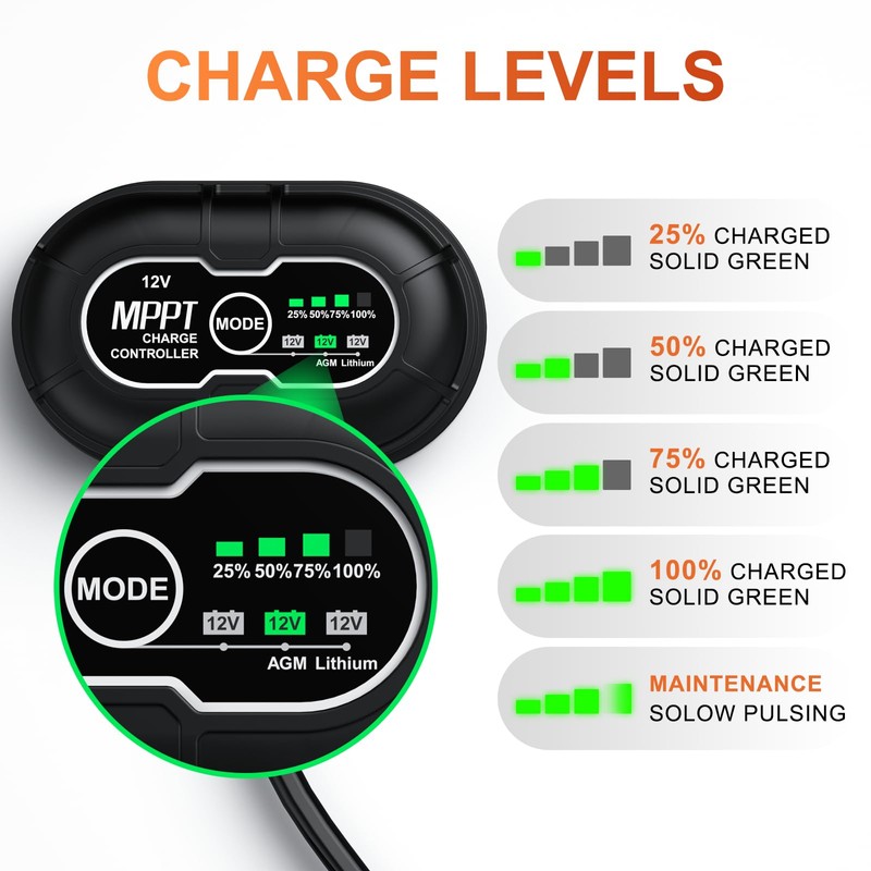 - 【 Visual Charging Level】The charge level indicators allow to visually monitor the stage of charge among 25%-50%-75%-100%. It's not just a solar battery trickle charger, it's an advanced solar battery charger maintainer. A fully-automatic, worry-free smart solar battery charger with zero overcharge.