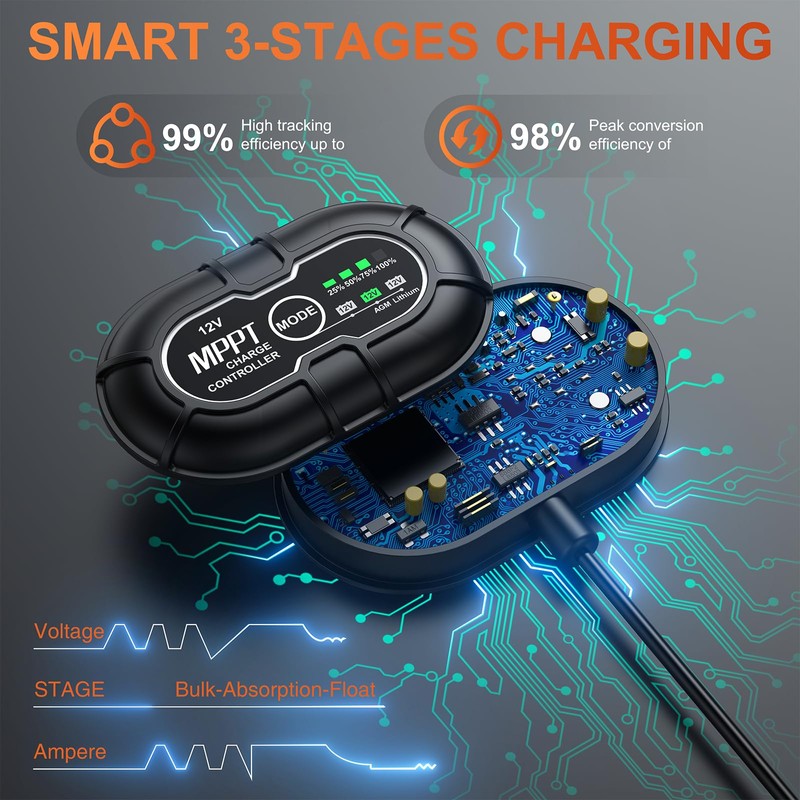 - 【Ultra-Smart MPPT Technology】This 12v solar panel battery charger is crafted with SUNER POWER's unique Ultra-Smart MPPT technology, the innovative MPPT ( Max Power Point Tracking) allows to deliver high tracking efficiency of up to 99% and peak conversion efficiency of 98%, improving approximately 20%-30% utilization rate than other competitors.