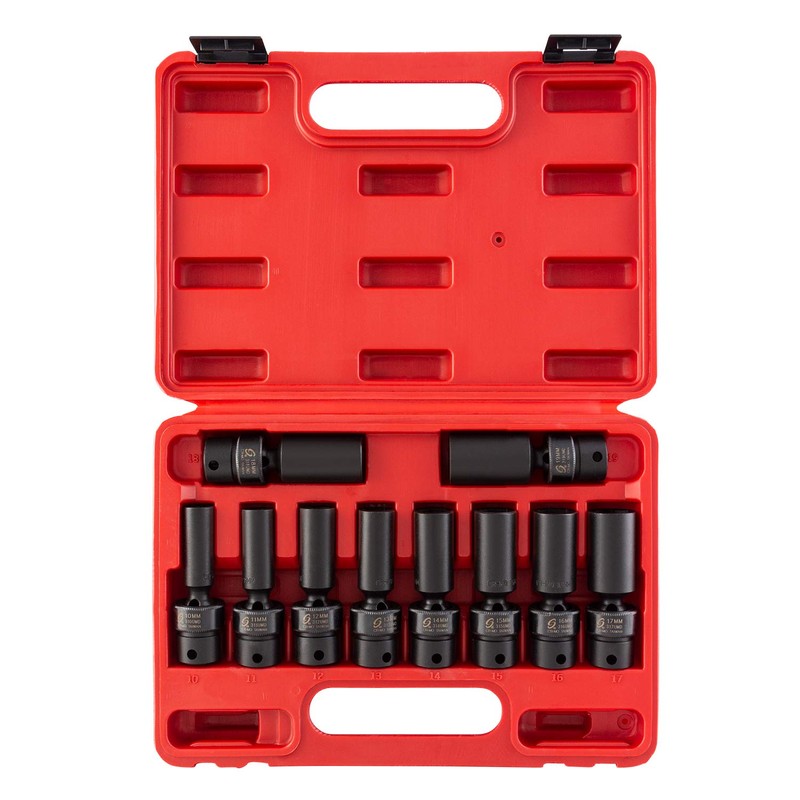 This Sunex 3/8 inch drive 10 piece metric universal deep socket set includes the most common sizes used for automotive repair. It includes 10 metric deep sockets. It is made of CR-MO alloy steel for long life. It is fully guaranteed and includes a heavy molded storage tray.