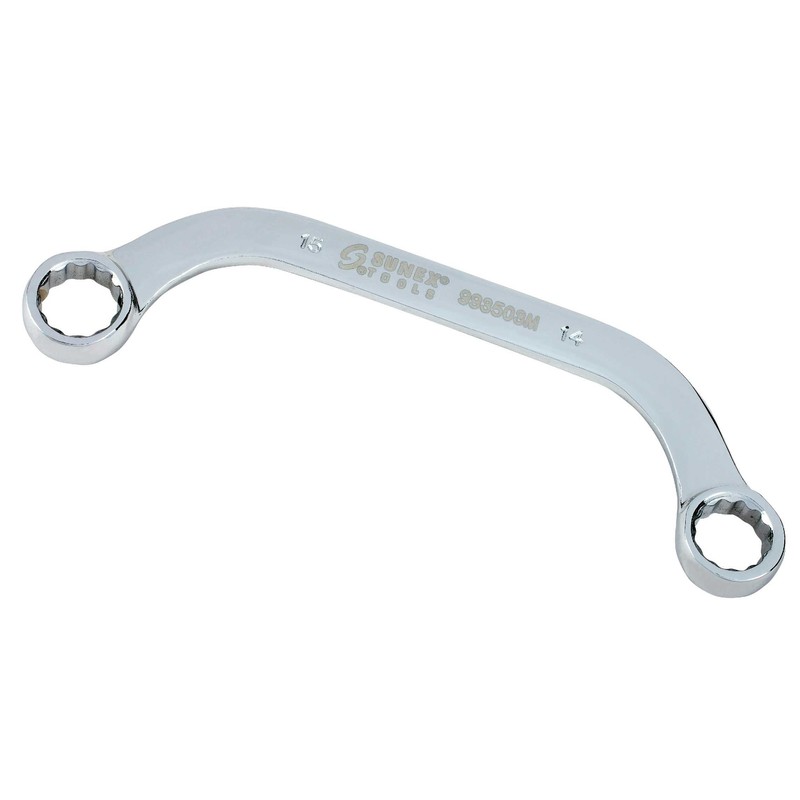 Sunex's 14mm by 15mm fully-polished half-moon double box wrench is forged out of an alloy steel. It features a curved design for access to confined areas, and is built for maximum durability.