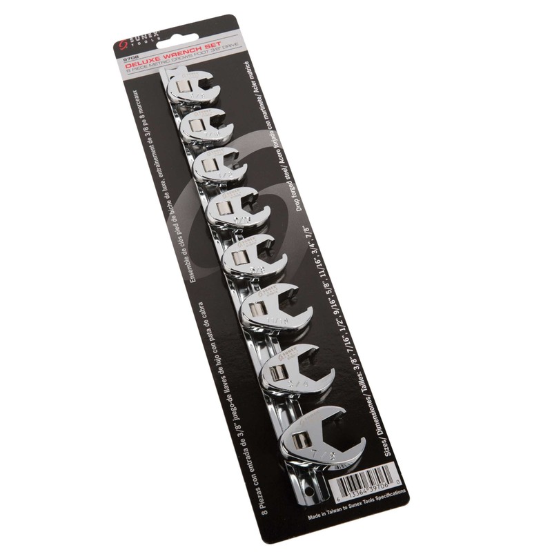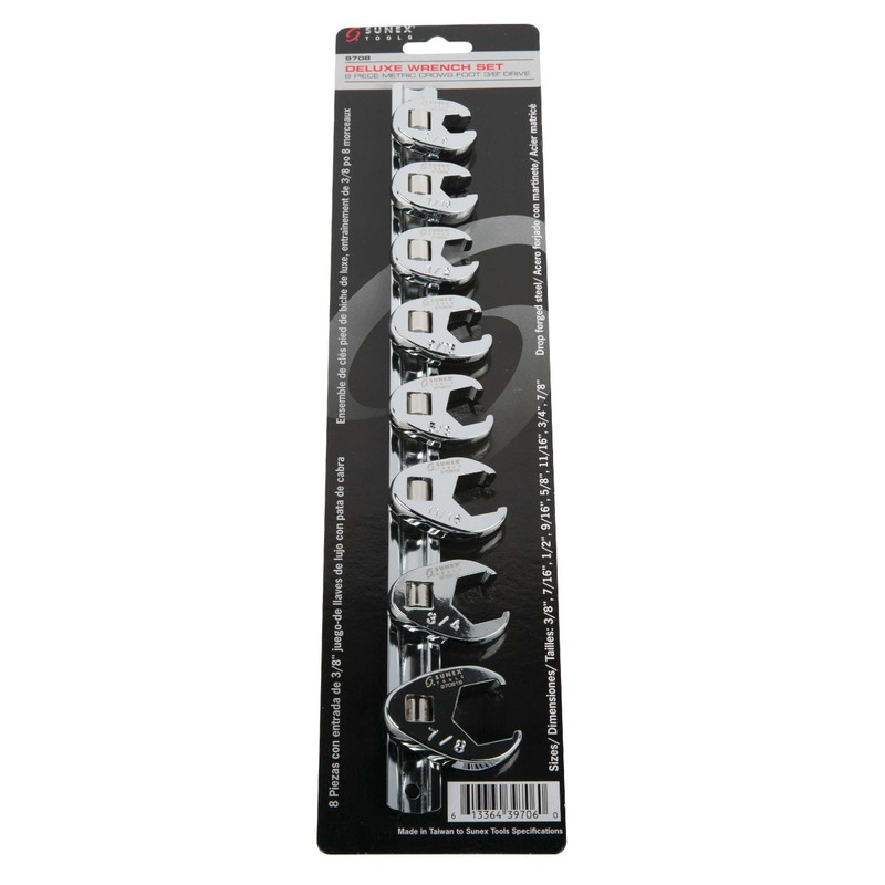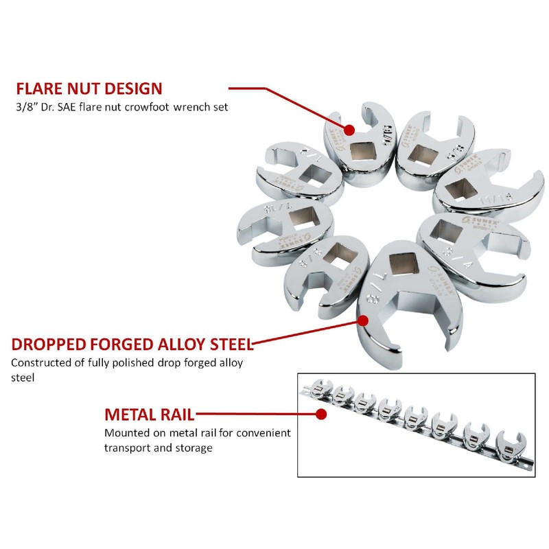 From the ManufacturerThis Sunex 8 piece flare nut crowfoot wrench set includes the most common sizes used for automotive repair. It includes 8 SAE wrenches made of fully polished drop forged alloy steel. They are mounted on a convenient storage rail.