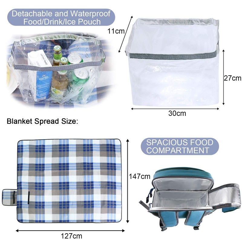 - Large Capacity & Functional Cooler Compartment - Measured 14''x 11''x 5''. Roomy enough for 4 person's picnic supplies and keep food fresh and cold for hours. Picnic basket for family contains an additional detachable waterproof pouch allows you to put ice, cold beers or other items into cooler picnic backpack, easy to clean and avoid getting the insulted compartment wet. With a detachable cooler wine pouch, you can also enjoy chilled wine with your loved ones.